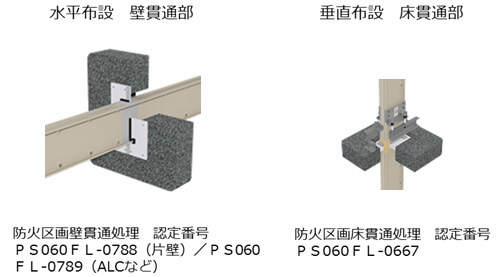 火災時には、配線が延焼して、安全な区画に煙が充満し、避難行動に支障をきたしたり、火災が拡大したりしないよう、防火区画等を貫通する部分(床、壁等)には、防煙、延焼防止の措置を行っています。