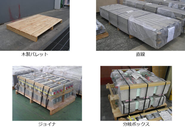 バスダクトの搬入時の梱包は、直線は数本をまとめて、それ以外は一品ずつポリエチレンシートで包装し、木製パレットにのせて、バンドで固定します。
