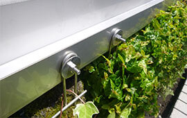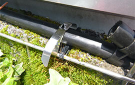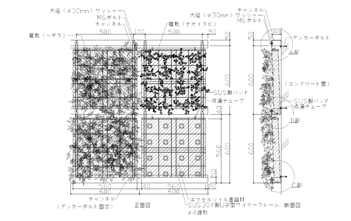 | 構成 | SUS鋼線フレーム+緑化基盤材+点滴チューブ+Cチャンネル ※かん水ピッチ150mm ※Cチャンネルは別途工事 |