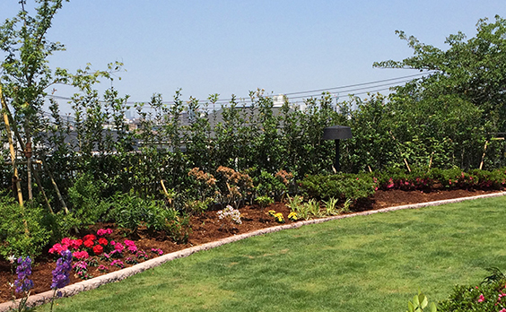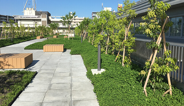 システム重量は48kg/m2(芝生、満水時)と超軽量です。また、コンテナに客土することにより低木や中木まで様々な植栽デザインに対応可能です。