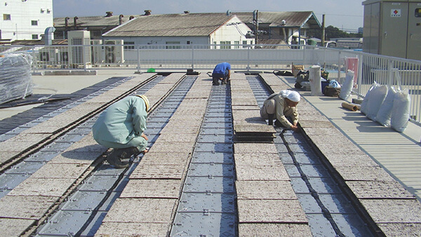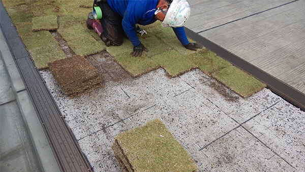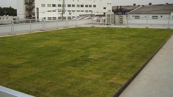 芝生の場合、48kg/m2(満水時)と最軽量です。ユニットコンテナに土を50mm盛り、地被類を植えた場合でも75kg/m2と軽量で、従来の客土式工法よりも建築物に荷重負担がかかりません。