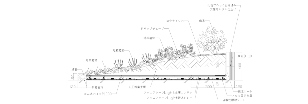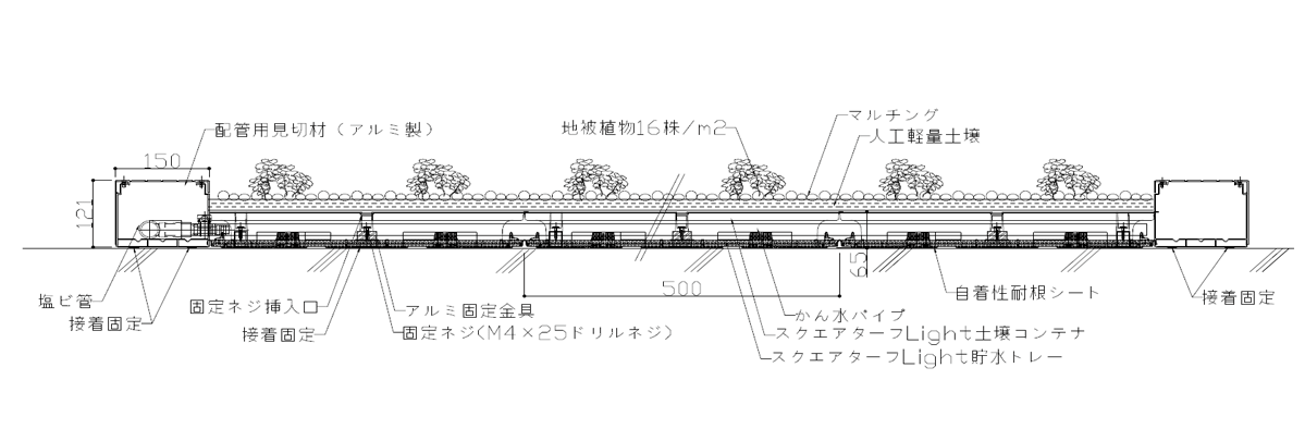 | 構造 | 踏圧防止構造 根腐れ防止構造 敷設面固定構造 コンテナズレ防止構造等 |