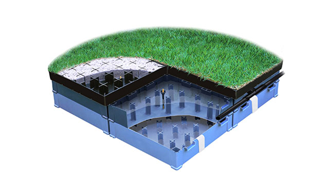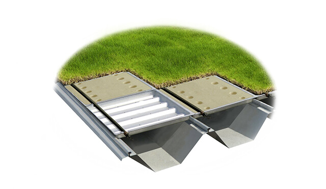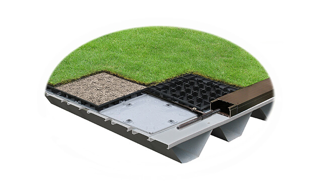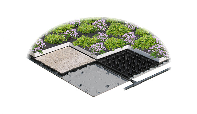 底面に貯水トレーを備えた雨水有効利用型屋上緑化システムです。また、水検知センサーにより植物に必要な水量を自動管理する省管理型のセンサ式自動潅水システムを常備しています。